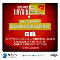 Eskil AGD'den Çin Zulmüne protesto için davetEskil AGD bugün (1 Temmuz Çarşamba) Teravih Namazından Sonra Eskil Ulu Cami Önünde Doğu Türkistan'daki Kardeşlerimize Destek Amaçlı Basın Açıklaması yapacak.01 Temmuz 2015 Çarşamba 09:44