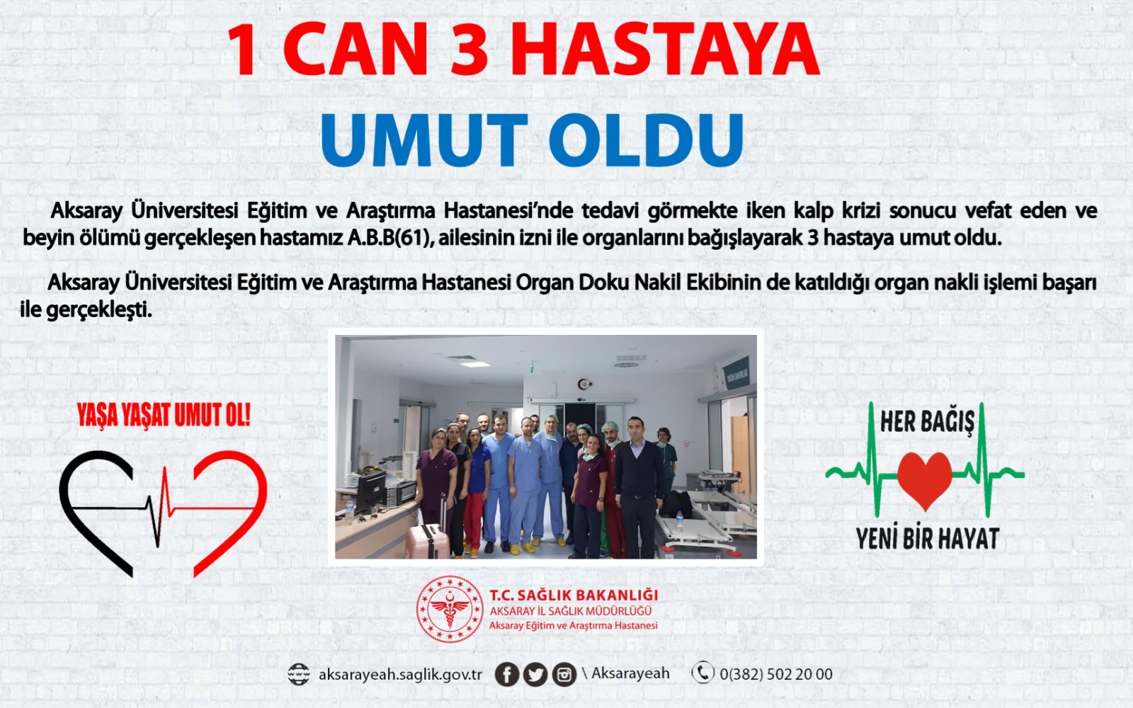 Aksaray Üniversitesi Eğitim ve Araştırma Hastanesi’nde tedavi görmekte iken kalp krizi sonucu vefat eden ve beyin ölümü gerçekleşen hastamız A.B.B(61), ailesinin izni ile organlarını bağışlayarak 3 hastaya umut oldu.