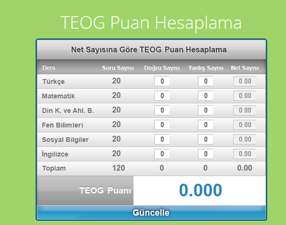 TEOG için yapılan sınav aynı zamanda okuldaki dersinin sınavı olarak da kabul ediliyor. Bu durumda hem yazılı notu yerine geçmesi hem de liseye yerleştirilmede esas olacak puan olduğundan çok daha dikkat edilmesi gerekli. Her ders için 20 soruluk 4 şıklı sorular soruluyor. Yanlış cevaplar doğru sayısını etkilemiyor. Bu ortak sınavlarda çocukların okulda gördükleri konular üzerinden sorular soruluyor. TEOG hesaplaması biraz karışık görünüyor. Bu sınava girenlerin puanlarını buradan hesaplayabilirsiniz Okulistik her öğrencinin yanında.