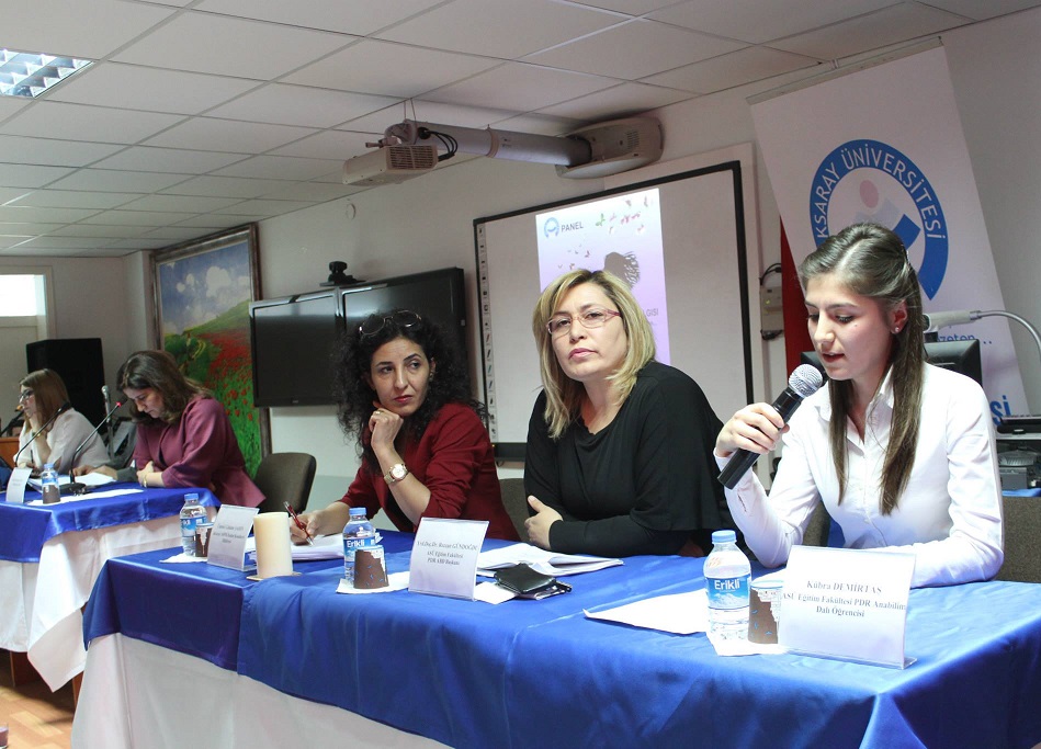 Kadına karşı negatif unsurların eğitimle düzelebileceğini ve bu noktada ilk öğretmen olan annelere önemli görevler düştüğünü ifade eden Yılmaz, “0-3 yaşarası, karakterin şekillendiği bir dönemdir ve burada çocuğun en esaslı öğretmeni olan anneye büyük rol düşmektedir. Anne, kız veya erkek çocuk eğitiminde boşluk bırakırsa, bu boşluk zamanla farklı etkenler tarafından işgal edilir” dedi. Finlandiya’dan örnek veren ve Finlandiya’nın akademik başarıda efsane bir ülke olduğunu ifade eden Dekan Yılmaz, “Ancak en fazla cinsel tacizin, istismarın, madde bağımlılığının olduğu yer de burasıdır. Akademik başarı ile ahlaki başarı farklı şeylerdir. Bu ancak, değerler eğitimiyle verilebilir” dedi. Panelde Psikolojik Danışmanlık ve Rehberlik Anabilim Dalı Başkanı Yrd. Doç. Dr. Rezzan Gündoğdu “Kadın ve Toplumdaki Statüsü,” PDR Anabilim Dalı öğrencisi Kübra Demirtaş “Bir Öğrenci Olarak Kadın Olmak,” Aksaray Barosu Kadın Komisyonu Başkanı Avukat Fulya Yavuztürk Özkaraca “Şiddet, İstismar ve Cinsel Tacizde Hukuki Süreçlerde Kadının Hakları,” Aksaray Kadın Konukevi Müdiresi Ümmügülsüm Şahin “Şiddete ve İstismara Maruz Kalan Kadınların Sığındığı Ortam Olarak Kadın Konukevi” ve Aksaray Asayiş Şube Müdürü Tarık Ziya Turan “Kadına Dönük Suçlarda Asayiş Tedbirleri” konularında açıklamalar yaptı. Panel moderatörlüğünü Eğitim Bilimleri Bölüm Başkanı Doç. Dr. Figen Akça yaptı.