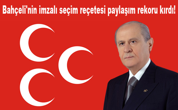 MHP Genel Sekreteri İsmet Büyükataman'ın sosyal paylaşım sitesinde paylaştığı 'Dr. Devlet Bahçeli' imzalı reçete, ülkücüler arasında paylaşım rekoru kırdı. Bahçeli'nin imzasının yer aldığı reçete de MHP'nin 7 Haziran seçimleri için hazırladığı sloganlardan biri olan "Tek çare MHP" yazıyor.