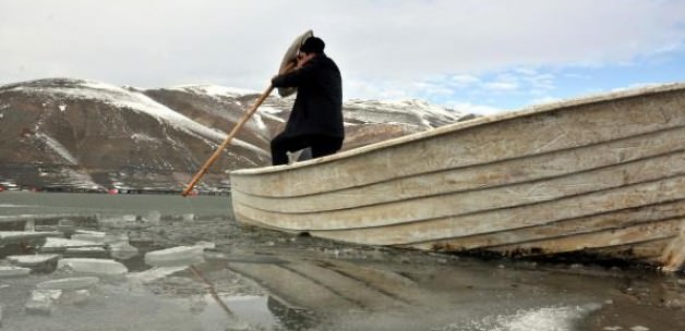 Soğuklarla birlikte barajın içinde bulunan tekneler ve kafesler, yaklaşık 15 santimetre kalınlığındaki buz kütlesine gömüldü. Balıkçılar buz kütlesini kırarak teknelerini çıkarmaya çalışıyor.