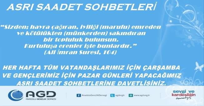 Her hafta çarşamba günleri tüm vatandaşlarımız için ve pazar günleri gençlerimiz için yapacağımız asrı saadet sohbetlerine davetlisiniz... denildi…