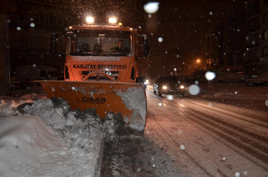 Konya'da aralıksız devam eden kar yağışının günlük hayatı olumsuz etkilememesi için Karatay Belediye'sinde kar temizliği gece-gündüz demeden sürüyor. Kar ve buzlanmaya karşı; kar küreme, tuzlama ve solüsyon çalışması yapan Karatay Belediyesi Fen İşleri Müdürlüğü ekipleri vatandaşların olumsuz etkilenmemesi için büyük çaba harcıyor. Ekipler çalışmalarına sadece gündüz değil gece de devam ediyor. Yoğun mesai harcayan karla mücadele ekipleri ilçe merkezi ve yeni bağlanan mahalle ve beldelerde yol açma çalışmalarını sürdürüyor. Konu ile ilgili açıklama yapan Karatay Belediye Başkanı Mehmet Hançerli, 'karla mücadele ekiplerimiz tuzlama ve solisyon çalışmalarına hız kesmeden devam ediyor. Biz öncelikli olarak vatandaşımızın huzurunu ve rahatını düşünüyoruz, gündelik işlerinde herhangi bir aksama olmaması için ekiplerimiz büyük bir özveri ile çalışıyor. Greyderlerimiz, kar bıçaklı kamyonlarımız, solisyonlu araçlarımız, tuzlama ekiplerimiz, kamyonlarımız hepsi karla mücadele etmeye hazır" diye konuştu. Öte yandan Karatay Belediyesi vatandaşların karla mücadelede whatsapp hattı ile gelen istek ve şikayetlerine anında cevap vererek yardımların ulaşmasını kolaylaştırıyor.