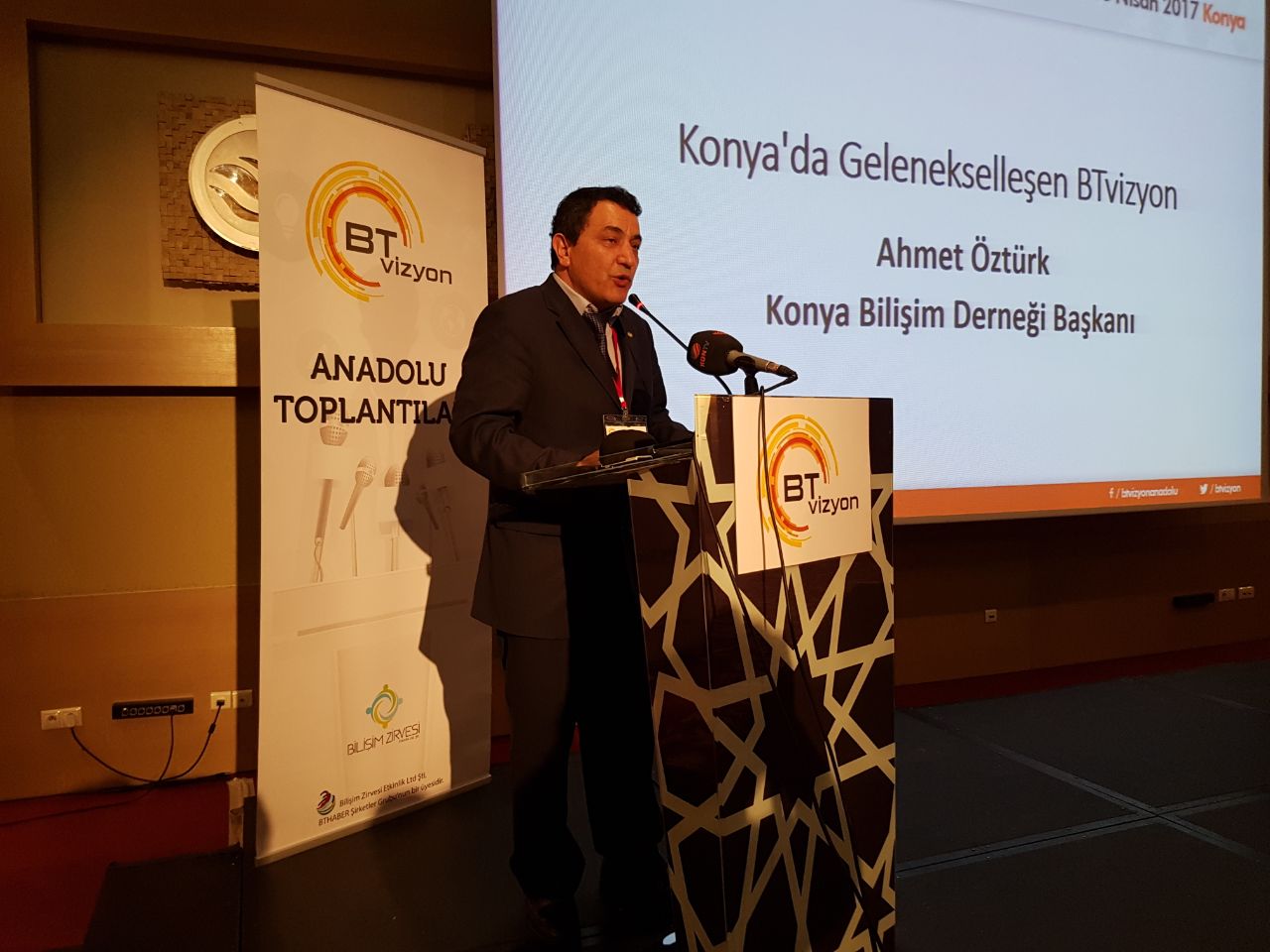 Programın açılış konuşmasını yapan Konya Bilişim Derneği Başkanı Ahmet Öztürk, BTvizyon etkinliklerinin bilişim konusunu gündemde tutma açısından oldukça önemli olduğunu söyledi. Sektörün bazı sıkıntılarından bahseden Öztürk, “Kamu kurumlarının ve belediyelerin, özellikle bilişim eğitimi alanında, özel sektörle yok edici rekabeti yıllardır aşmaya çalıştığımız önemli bir sektör sorunudur. Sektörümüz mensupları, 2014-2018 bilgi toplumu stratejisi ve eylem planında yer verilen, teşvik ve desteklerden, KOSGEB ve İŞKUR’un sağladığı eleman desteğinden yeterince yararlanamıyor. Staj başlangıcında yapılan SSK girişinin emekliliğe etkili olmaması sektör çalışanlarında mağduriyete neden oluyor. Bilişim alanında işyeri açılışında standartların olmaması nedeniyle, yetkinliğe sahip olmayan kişilerce kurulan bilişim firmaları, haksız rekabete neden oluyor ve kararlılığı ortadan kaldırıyor” ifadelerini kullandı.