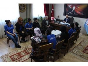 ‘Senin Dünyan, Senin Sınıfın’ temasıyla düzenlenen ve genç mucitlerin öğrenmenin daha kolay, eğlenceli ve kalıcı olmasına dair yenilikçi çözümler sundukları ‘Bilim Kahramanları Buluşuyor’ turnuvasında ‘Özdeğerler Jürisi Ödülü’ne layık görülen öğrenciler Esra Nur Atmaca, Fatoş Oymak, Rabia Kaya, Fatma Köksal, Ayşe Sütmen, Büşra Yar ve Songül Körük, Milli Eğitim Şube Müdürü Affan Başbuğ, Okul Müdürü Bayar Caner ile Milli Eğitim Müdürü Hacı Ömer Kartal’ı ziyaret etti. 21-22 Mart’ta İzmir’de yapılacak Ulusal Turnuva öncesinde Milli Eğitim Müdürü Hacı Ömer Kartal’ı ziyaret eden mucit öğrenciler, hedeflerinin birincilikle dönmek olduğunu söyledi.