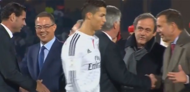 Real Madrid takımı ve yöneticileri, şeref tribününde bulan protokol ile tokalaşırken, Cristiano Ronaldo, UEFA Başkanı Michel Platini’ye tepki gösterdi.