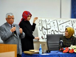 Sohbetin ardından Sare Davutoğlu Geleneksel Türk Sanatları Bölümü hat ve ebru sanatı atölyelerini gezdi. Uygulamalı çalışmalardan oluşan sergide öğrencilerden çalışmaları ile ilgili bilgi aldı. Yrd. Doç. Dr. Hüseyin Öksüz tarafından Dr. Sare Davutoğlu’na ebru zemin üzerine isminin yazılı olduğu bir tablo günün hatırası olarak sunuldu.