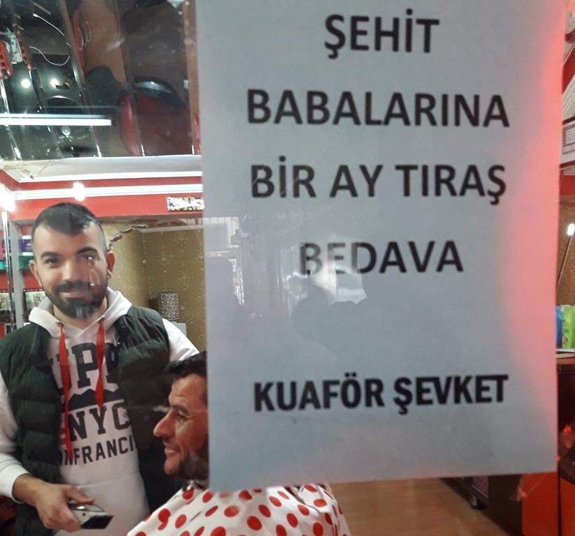 Aksaray’da eski sanayi caddesi Merkez Camii girişinde kuaförlük yapan Kuaför Şevket Kaya Afrin de şehit olan askerlerimize meslek olarak destek olmak için Aksaray’da bulunan tüm şehit babalarını bir ay süre ile bedava traş etmeye karar verdi. İşyerinin camına bunu duyuran bir yazı astı.