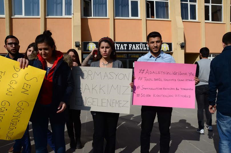 FEF öğrencileri adına basın açıklamasını okuyan Samet Sayem, “Yıllardır FEF öğrencileri başta olmak üzere bir çok fakültede alınan pedagojik formasyon eğitimin 15 bin kontenjan ile sınırlı kalarak biz öğrencilerin mağdur edilmesidir. Öğrencileri özel eğitim kurumlarına, özellikle de dershanelerin kölesi olmaya zorlamakta ve işsizliğe sürüklemektedir” dedi.