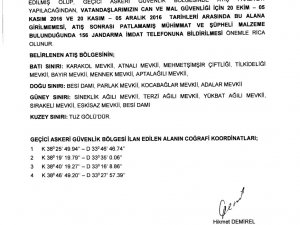 İl Jandarma Komutanlığının ilgi sayılı yazısı ekinden alınan, Tuz gölü güneyinde icra edilecek atışların emniyetli bir şekilde yapılabilmesi maksatıyla ekte koordinat bilgileri gönderilen bölgenin 20 Ekim- 05 Kasım 2016 ve 20 Kasım - 05 Aralık 2016 tarihleri arasında ''Geçici Askeri Güvenlik Bölgesi'' olarak ilan edildilmiştir.
