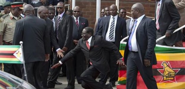 Mugabe düşerken, yanındaki korumaların müdahale etmekte ağır kaldığı görüldü.
